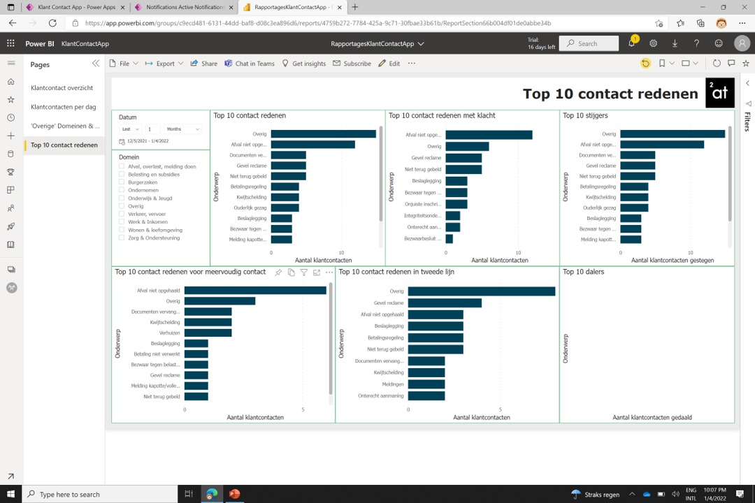 Heeft u scherp in beeld waarom burgers, ondernemers, studenten of patiënten contact opnemen en wat de problemen zijn waar zij hulp bij nodig hebben? Weet u of verzoeken na het contact ook echt snel afgerond opgelost of waar structureel knelpunten zitten? Om uw klanten goed te helpen en uw dienstverlening structureel te verbeteren is goed inzicht in contactredenen en -afhandeling belangrijk, maar vaak is de data onvoldoende aanwezig. De Klantcontact app van 2at ondersteunt uw bij het data gedreven maken van uw dienstverlening. Met de Klantcontact app worden uw medewerkers in staat gesteld om binnen 10 seconden elke contact inclusief het resultaat te registreren. De Klantcontact app genereert automatisch rapportages, en geeft real-time inzicht in de voornaamste contactredenen per domein, welke contacten tot herhaalcontact leiden, waar de klantreis blokkeert of zelfs tot frustratie leidt. Door bijvoorbeeld informatievoorziening te verbeteren, processenstappen aan te passen of integraler te werken is het vaak mogelijk om effectiever te werken, de burgers tevredener te maken en het aantal contactmomenten te reduceren. Zo kunt u meer met minder doen. De Klantcontact app biedt u de data om gericht te acteren en knelpunten en kansen met de grootste impact doeltreffender aanpakken.