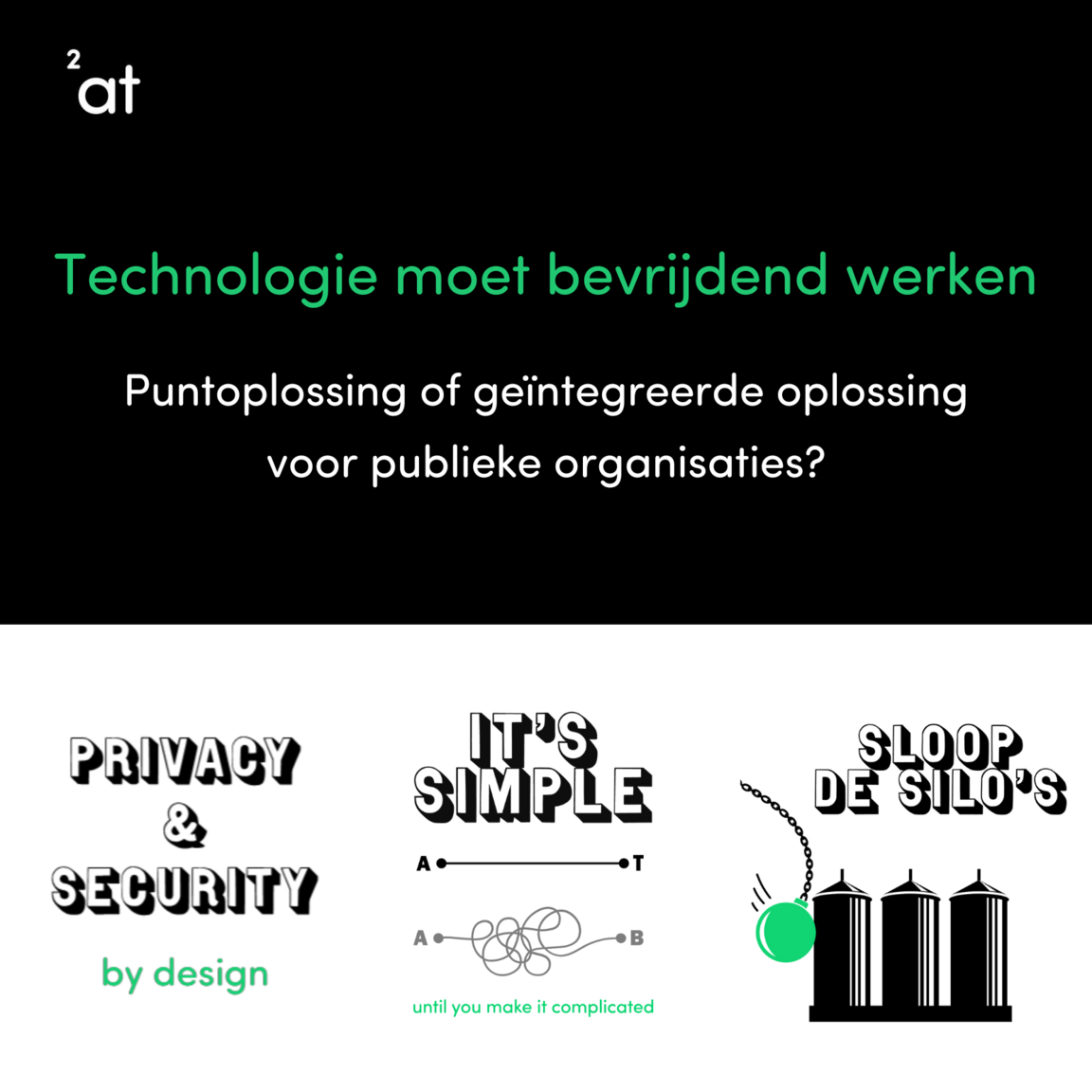 Voor zowel de commerciële/particuliere als publieke organisaties is het van groot belang dat zakelijke IT-beslissers in hun technologie strategie rekening houden met het rendement van de investering en het vizier richten op de langere termijn, zeker voor publieke organisaties. Een belangrijke overweging binnen deze strategie is het kiezen voor het juiste applicatielandschap, want deze explosie aan digitale hulpmiddelen kunnen juist meer problemen opleveren als oplossen. Bij 2at zijn we er unaniem over uit dat technologie bevrijdend moet werken voor een beter functionerend Nederland. Daarom geloven wij dat overheden en onderwijsinstellingen in (geïntegreerde) platformen moeten gaan denken en af moeten stappen van talloze puntoplossingen. Waarom dit zo belangrijk is, leggen wij uit in deze blog. Wat zijn puntoplossingen?