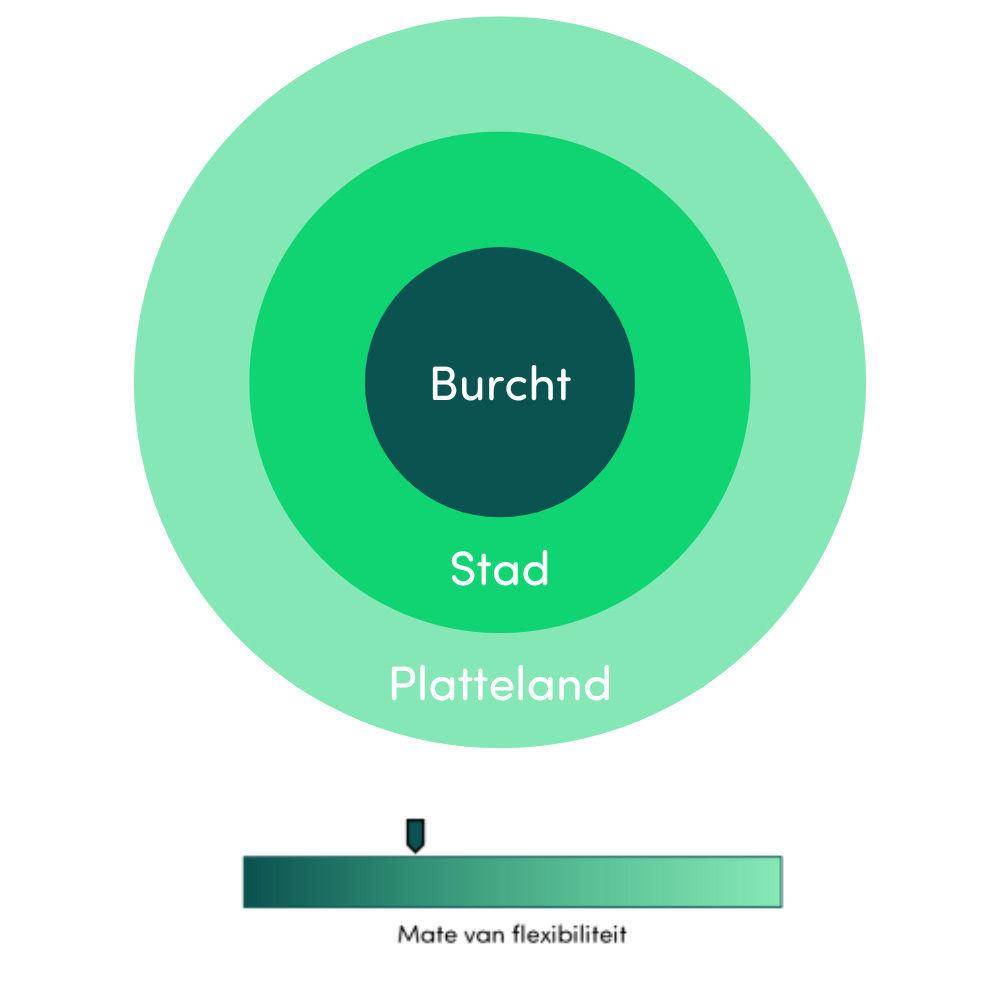 In het "platteland" krijgen mensen maximale ruimte en zijn ze zelf verantwoordelijk voor de app en het beheer ervan. In de stad gelden duidelijke kaders (opgesteld vanuit de IT-afdeling) waarbinnen medewerkers de vrijheid krijgen om te ontwikkelen, en waarbij per geval wordt bekeken waar het beheer wordt ondergebracht. In de burcht bevinden zich de meest risicovolle/bedrijfskritische applicaties waarvoor strikte regels gelden.