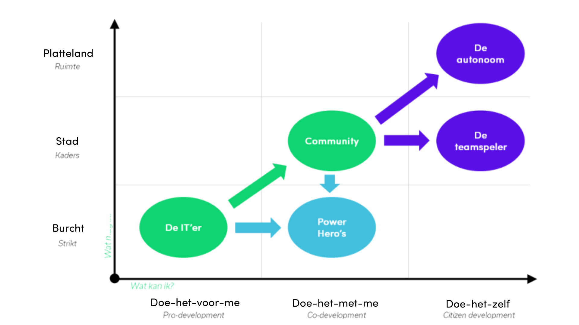 In de strategie richten we ons er allereerst op om binnen de organisatie een community van "citizen developers" te creëren die beginnen met enkele kleine en succesvolle apps, die andere afdelingen binnen de organisatie inspireren. Wanneer deze eerste "incubatiefase" succesvol is doorlopen, gaan we over naar de "expansiefase", waarbij de focus meer wordt gelegd op architectuur en governance om enerzijds grip te houden en tegelijkertijd autonomie meer decentraal in de organisatie te laten plaatsvinden, zodat we daadwerkelijk kunnen spreken van citizen development. In een derde en laatste fase is de ambitie om op een wezenlijk andere, innovatieve manier bedrijfsvoering te laten werken aan meer innovatieve, op de business gerichte scenario's met impact.